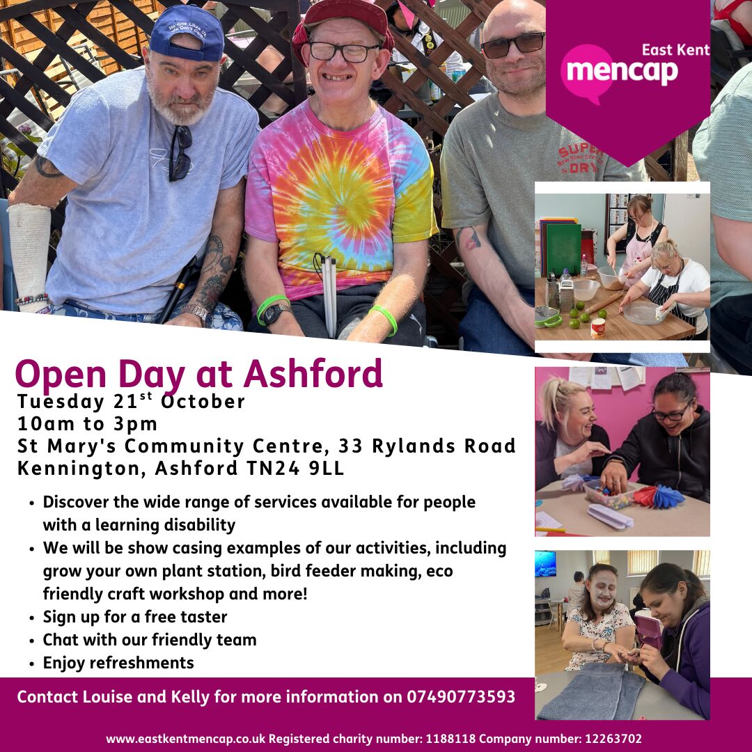 We’re thrilled to invite you to our Open Day at Ashford – a celebration of creativity, connection, and the incredible services East Kent Mencap offers for people with a learning disability.